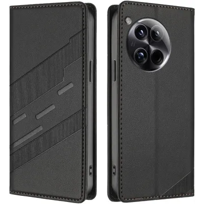 • Phonesta Embossed Lines Book Wallet Klapphülle für OnePlus 12 - Schwarz